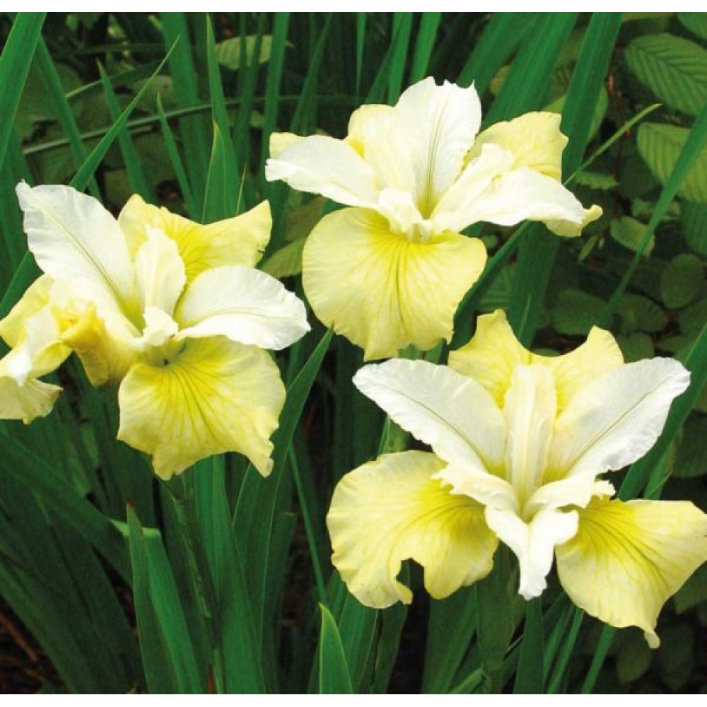 Ирис MOON SILK один из лучших бело-жёлтых сортов сибирских ирисов по форме лепестков и размеру цветка (диаметр 14 см). Верхние лепестки цветка белые, нижние зеленовато-желтые.