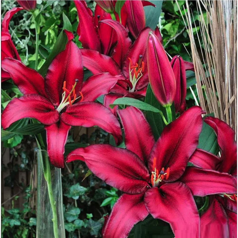 Лилия с крупным размером цветков (20-25 см) и яркой окраской – насыщенный винный цвет с добавлением черных вкраплений. Количество цветков на одном цветоносе составляет 3-4 штуки.