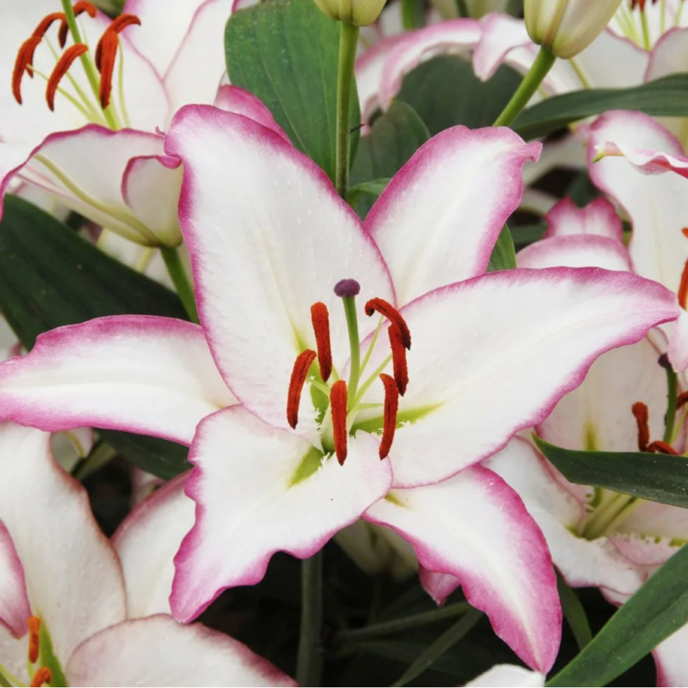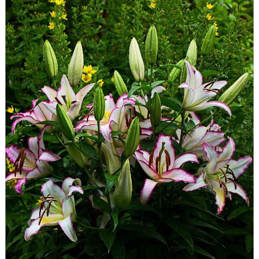 Цветки крупные, хороший аромат. Очень эффектные крупные белые цветки с ярко выраженным темно-сиреневым обрамлением. Высота лилии около 120 см.